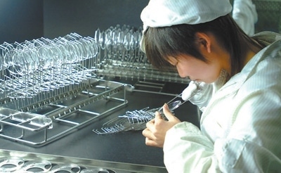 在江蘇丹陽市一家光學(xué)眼鏡有限公司,工作人員在鍍膜車間內(nèi)檢查、填裝鏡片。新華社記者 李 博攝