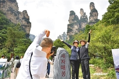 今年前往湖南省張家界市旅游的韓國(guó)游客數(shù)量大幅增長(zhǎng)。圖為在張家界國(guó)家森林公園十里畫廊景區(qū),韓國(guó)游客在“三姐妹峰”前拍照留影。新華社記者 陳振海攝