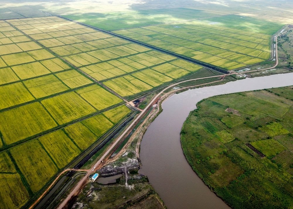 這是莫桑比克萬(wàn)寶莫桑農(nóng)業(yè)園的水稻田(2019年4月7日攝,無(wú)人機(jī)照片)。萬(wàn)寶莫桑農(nóng)業(yè)園是中非合作的大型水稻種植項(xiàng)目,極大地緩解了莫桑比克糧食短缺問題。