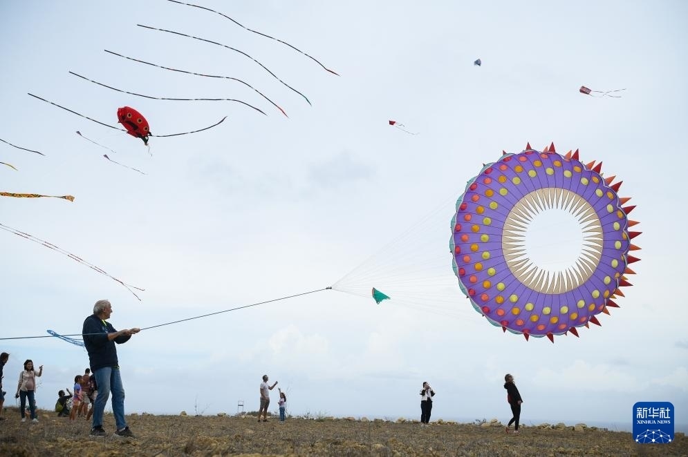 10月19日,在馬耳他戈佐島阿爾卜,人們?cè)诘?屆戈佐國際風(fēng)箏節(jié)上放風(fēng)箏。
