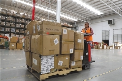 美獅集團(tuán)墨西哥州海外倉(cāng)內(nèi),一名員工從傳送帶取下貨物放到拖車上,準(zhǔn)備移動(dòng)至智能上架區(qū)入庫(kù)。本報(bào)墨西哥分社 埃內(nèi)斯托·多明戈斯攝