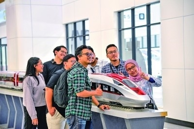 老撾《萬象時(shí)報(bào)》記者索薩坤·萬喬在參觀廣元千佛崖時(shí),拍攝飛馳而過的動車組列車。老撾國家通訊社記者 汶娜萊·楠坎娜攝