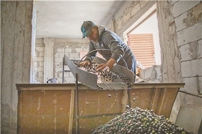 工人在篩選送入加工車間的橄欖果。