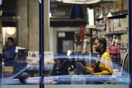 2022年5月6日,在美國(guó)華盛頓,一家超市的員工在收銀臺(tái)旁工作。新華社發(fā)(沈霆攝)