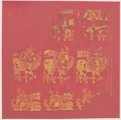 “紅地翼馬紋錦”經(jīng)向長52厘米、緯向?qū)?1厘米,以紅色經(jīng)線為地,米白色緯線以斜紋重組織成翼馬圖案,具有明顯的中亞、西亞風(fēng)格。目前紋錦圖案殘存3排翼馬,中間一排3匹馬右行,上排兩匹(殘損嚴重)和下排3匹均為左行。馬頭戴花狀冠飾,頸系連珠紋帶,連珠紋帶綴有兩條飄帶,從頸后水平狀飄揚。馬胸兩側(cè)生翅,翅上鑲有連珠紋,四足及尾部系縛綢帶結(jié),造型別致,充滿浪漫華貴氣息,是典型的薩珊波斯風(fēng)格。