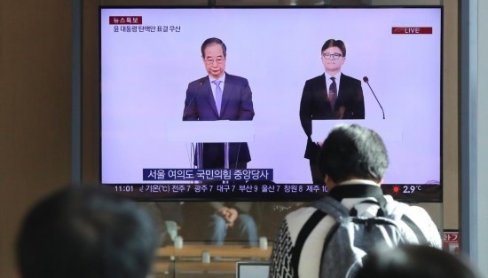12月8日,在韓國首爾火車站,民眾觀看韓國執(zhí)政黨黨首韓東勛與國務(wù)總理韓德洙(左)共同會見記者的電視直播。新華社記者 姚琪琳 攝