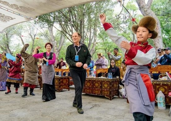 2023年5月,柯馬凱參觀林芝市第二小學。圖為柯馬凱(前排右二)和藏族民眾一同跳舞。