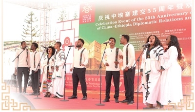 在近日舉辦的“慶祝中埃塞建交55周年暨歡樂春節(jié)活動”上,當(dāng)?shù)孛癖姾铣H肀葋唫鹘y(tǒng)歌曲。