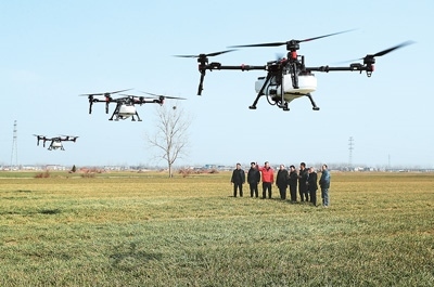 近日,安徽省亳州市蒙城縣樂土鎮(zhèn)屈廟村田間,農(nóng)機(jī)技術(shù)人員(左三)向飛手介紹植保無人機(jī)作業(yè)的安全要求及注意事項(xiàng)。