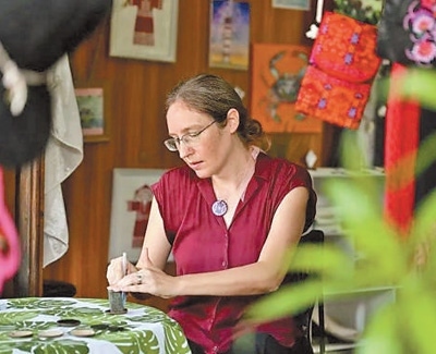 謝敏來(lái)自美國(guó)芝加哥,曾是一名英語(yǔ)老師的她,如今稱自己為設(shè)計(jì)師、小店店主。謝敏的小店叫“海島樂(lè)趣”,位于海南??诎咨抽T(mén)公園內(nèi)?!斑@是五指山市的黎錦手提包,這是保亭村子里的織品,那幾件是東方市的?!钡昀飻[放的黎錦作品出自海南各地村民之手,謝敏如數(shù)家珍。店中還有不少她親手設(shè)計(jì)和制作的文創(chuàng)產(chǎn)品,靈感都來(lái)自魚(yú)、烏龜、閃電等傳統(tǒng)黎錦紋樣。