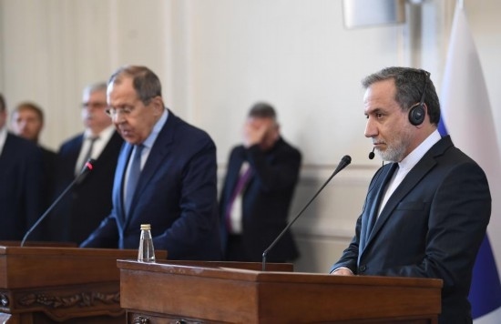 2025年2月25日,在伊朗德黑蘭,伊朗外交部長阿拉格齊(右)與俄羅斯外長拉夫羅夫出席聯(lián)合新聞發(fā)布會(huì)。新華社記者沙達(dá)提攝
