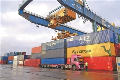 中歐班列重要樞紐——德國(guó)杜伊斯堡貨運(yùn)場(chǎng)站內(nèi)來(lái)自中國(guó)的集裝箱。