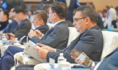 與會嘉賓在2025上合組織國家媒體合作論壇上,閱讀《共同的家園——上合組織成員國發(fā)展愿景民意調(diào)查報(bào)告》。