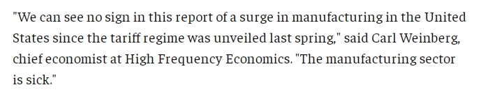 文章指出,美國(guó)政府曾辯稱,加征關(guān)稅是保護(hù)美國(guó)國(guó)內(nèi)制造業(yè)的必要之舉,但經(jīng)濟(jì)學(xué)家則認(rèn)為,由于包括勞動(dòng)力短缺在內(nèi)的結(jié)構(gòu)性問(wèn)題,美國(guó)制造業(yè)已無(wú)法恢復(fù)昔日輝煌。文章援引高頻經(jīng)濟(jì)咨詢公司首席經(jīng)濟(jì)學(xué)家卡爾·溫伯格(Carl Weinberg)的話表示,“從(ISM)這份報(bào)告中,我沒有看到自關(guān)稅政策出臺(tái)以來(lái),美國(guó)制造業(yè)出現(xiàn)任何增長(zhǎng)的跡象,美國(guó)制造業(yè)已經(jīng)病了?!?/p>