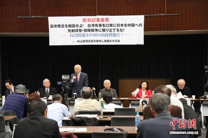 12月8日,日本多名學(xué)者及市民團(tuán)體代表在位于東京的日本參議院議員會館舉行記者會,要求日本首相高市早苗撤回涉臺錯誤言論。圖為“繼承和發(fā)展村山談話會”理事長藤田高景發(fā)言。中新社記者 朱晨曦 攝