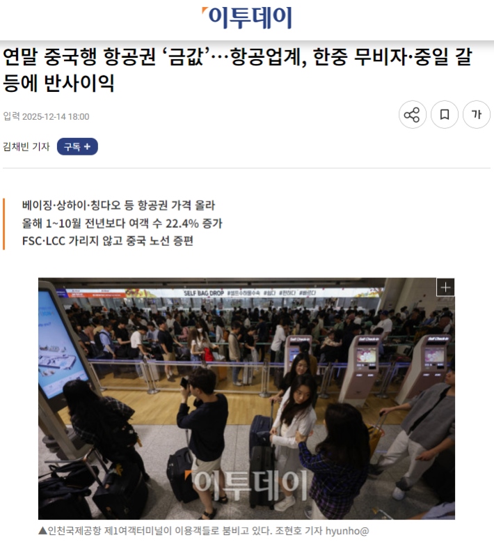 市場旺盛的需求直接傳導(dǎo)至價格層面。韓國《Etoday》近日一篇題為《年底飛往中國的航班“如同黃金般珍貴”》的報道,生動描繪了當(dāng)前中韓航線的熱度。報道指出,截至12月中旬,韓國飛往北京、上海、青島等主要中國城市的機票價格大幅上漲。例如,大韓航空執(zhí)飛的首爾-上海往返票價已漲至約40萬韓元,濟州航空的韓元-青島航線往返票價也接近30萬韓元。業(yè)內(nèi)分析指出,即便考慮季節(jié)性因素,當(dāng)前票價仍比去年同期高出約20%。來往中韓“一票難求”,華燈初上的明洞和外灘,熱氣騰騰的烤肉與火鍋,游客們的熱情互動給這個寒冷的冬天帶來暖意。