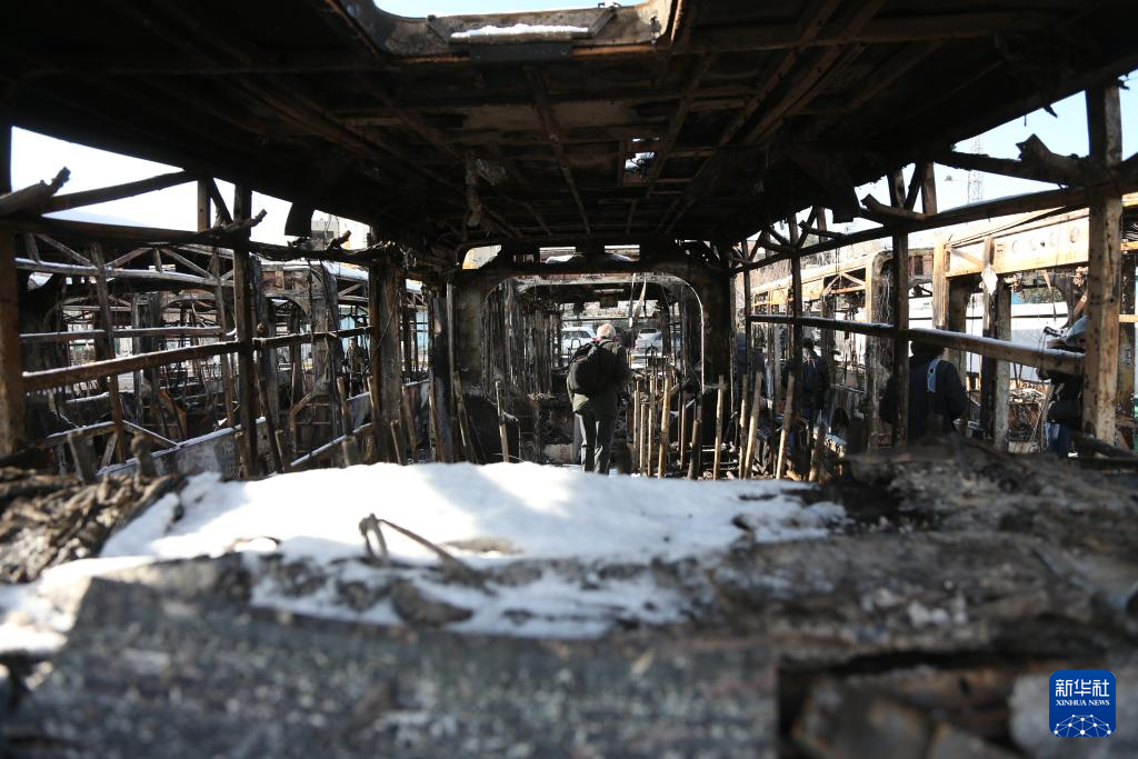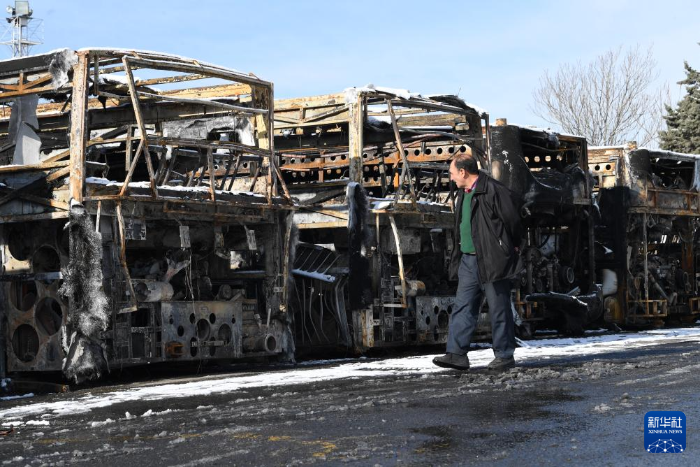 1月21日,在伊朗首都德黑蘭,一名男子走過在近期騷亂中被燒毀的公交車。新華社記者 沙達(dá)提 攝