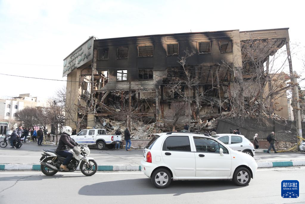 1月21日,在伊朗首都德黑蘭,車輛經(jīng)過在近期騷亂中受損的一處稅務(wù)局建筑。新華社記者 沙達(dá)提 攝
