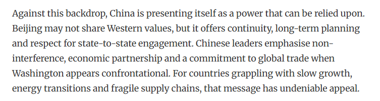 文章認(rèn)為,在此背景下,中國是可靠力量。中國提供了連續(xù)性、長期規(guī)劃和尊重國家間的交流。中國強(qiáng)調(diào)不干涉、經(jīng)濟(jì)伙伴關(guān)系和對維護(hù)全球貿(mào)易。對于那些正面臨增長緩慢、能源轉(zhuǎn)型和供應(yīng)鏈脆弱的國家來說,這一主張具有不可否認(rèn)的吸引力。另外,中國與美國不同,中國并不要求合作時必須實現(xiàn)意識形態(tài)上的一致性。中國提供市場、投資和交流。在不確定的時代,這些反而更體現(xiàn)了一種穩(wěn)定。