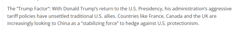 文章說,美國政府的強(qiáng)硬關(guān)稅政策令美國傳統(tǒng)盟友感到不安。法國、加拿大和英國等國家正日益將中國視為“穩(wěn)定力量”,以對沖美國保護(hù)主義帶來的風(fēng)險。