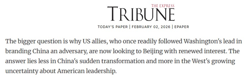 巴基斯坦《論壇快報》2日的一篇文章指出,為何曾緊跟華盛頓將中國視為“對手”的西方盟友們,如今對中國重燃興趣?答案不是中國的突然轉(zhuǎn)變,而是西方對美國不確定性日益加深的疑慮。