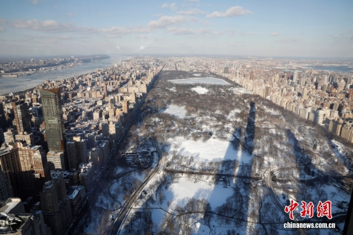 當(dāng)?shù)貢r(shí)間1月29日,從100層高樓俯瞰冰雪封凍的紐約市,中央公園白雪皚皚,遠(yuǎn)處的哈德遜河布滿浮冰。中新社記者 廖攀 攝