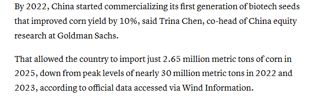 報道還稱,中國在農業(yè)研究與開發(fā)方面投入巨大,2019年至2021年其公共部門在這方面的支出大約是美國的兩倍。報道援引高盛中國股票研究部聯(lián)席主管的觀點稱,到2022年,中國已開始將第一代生物育種產業(yè)化應用,這些種子使玉米產量提高了10%。報道還援引萬得資訊獲得的官方數(shù)據(jù)稱,這使得中國在2025年的玉米進口量僅為265萬噸,遠低于2022年和2023年近3000萬噸的峰值水平。