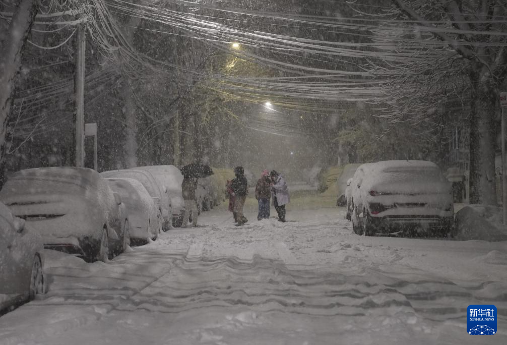 2月22日,在美國(guó)紐約,人們?cè)诮值郎嫌^看罕見大雪。新華社記者 張鳳國(guó) 攝