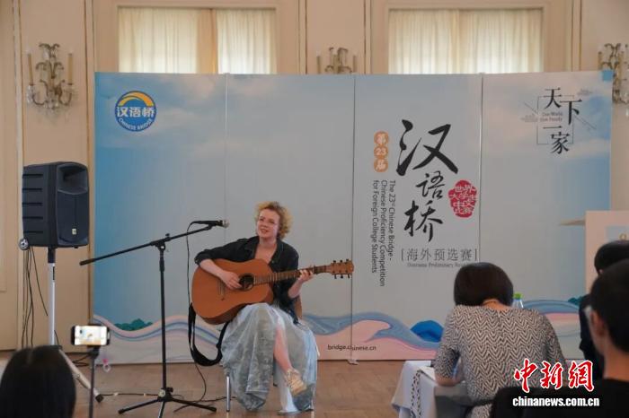 2024年5月25日,第二十三屆“漢語橋”世界大學(xué)生中文比賽德國區(qū)決賽在萊比錫舉行。圖為特等獎(jiǎng)得主李歡欣(Ann-Christin Otte)在比賽中展示才藝。中新社記者 馬秀秀 攝