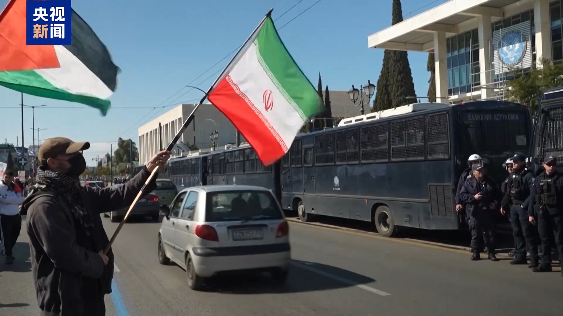 在希臘雅典的美國和以色列大使館前,逾千名示威者手持伊朗國旗或標(biāo)語牌、高喊口號參與游行示威活動,抗議美以對伊朗發(fā)動襲擊。為維護現(xiàn)場秩序,當(dāng)?shù)爻鰟哟罅烤Σ⒃诿绹鸵陨写笫桂^前使用一排警用大巴封鎖隔離。