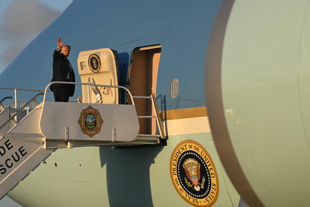 這是3月9日特朗普準備登上總統(tǒng)專機,從佛羅里達州返回首都華盛頓。法新社圖片