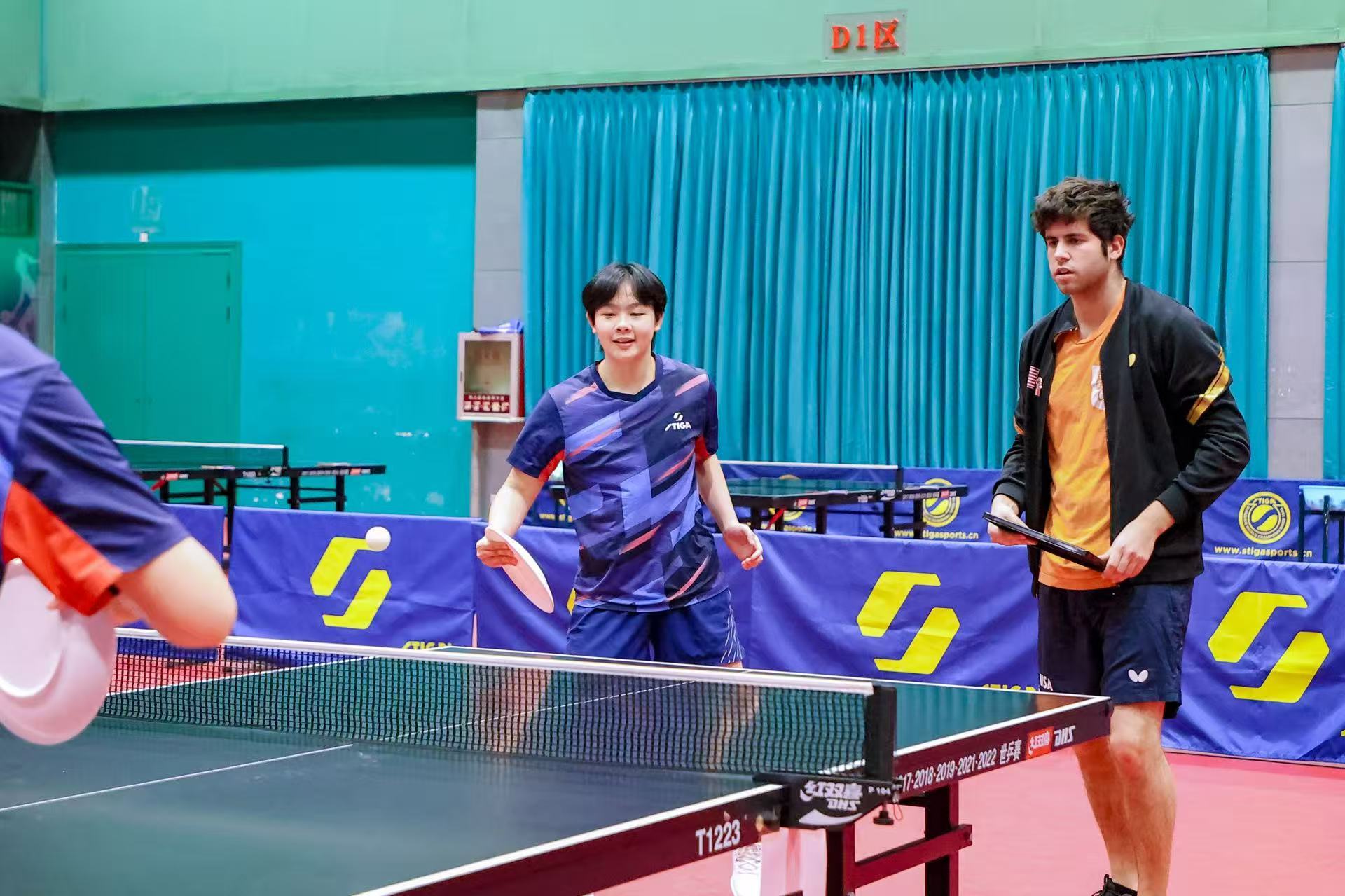 美國(guó)乒協(xié)注冊(cè)運(yùn)動(dòng)員凱?扎雷賓在正定國(guó)家乒乓球訓(xùn)練基地與中國(guó)青少年球員開展友誼賽