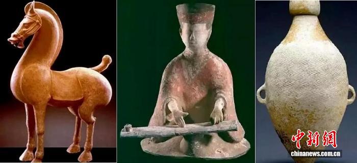 法國集美博物館藏(左起)東漢時期陶立馬 、 漢代彈箏陶俑彩色陶、仰韶文化半坡時期繭形雙耳瓶。圖片來源:人民網(wǎng)