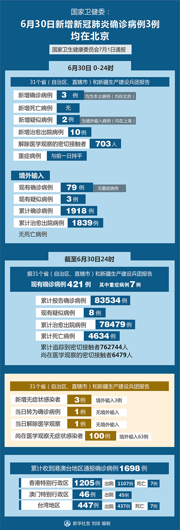 新華社北京7月1日電(記者胡喆)國(guó)家衛(wèi)生健康委員會(huì)7月1日通報(bào),6月30日0-24時(shí),31個(gè)省(自治區(qū)、直轄市)和新疆生產(chǎn)建設(shè)兵團(tuán)報(bào)告新增確診病例3例,均為本土病例(均在北京);無新增死亡病例;新增疑似病例2例,為境外輸入病例(均在上海)。