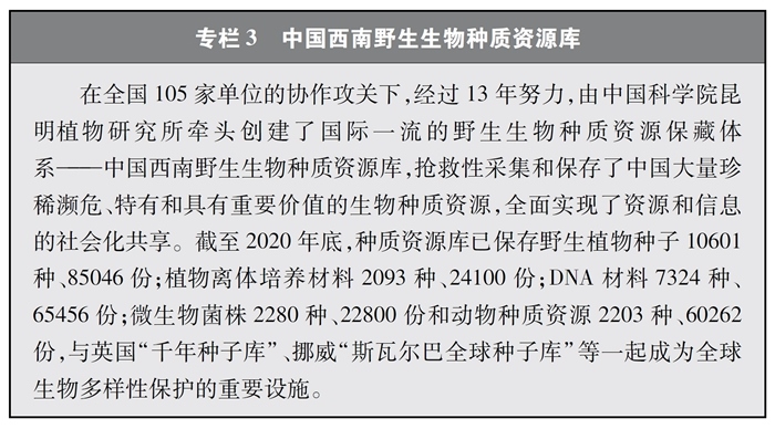 加快重要生物遺傳資源收集保存和利用。中國高度重視生物資源保護,近年來在生物資源調(diào)查、收集、保存等方面取得較大進展。實施戰(zhàn)略生物資源計劃專項,完善生物資源收集收藏平臺,建立種質(zhì)資源創(chuàng)新平臺、遺傳資源衍生庫和天然化合物轉(zhuǎn)化平臺,持續(xù)加強野生生物資源保護和利用。實施一批種質(zhì)資源保護和育種創(chuàng)新項目,截至2020年底,形成了以國家作物種質(zhì)長期庫及其復份庫為核心、10座中期庫與43個種質(zhì)圃為支撐的國家作物種質(zhì)資源保護體系,建立了199個國家級畜禽遺傳資源保種場(區(qū)、庫),為90%以上的國家級畜禽遺傳資源保護名錄品種建立了國家級保種單位,長期保存作物種質(zhì)資源52萬余份、畜禽遺傳資源96萬份。建設99個國家級林木種質(zhì)資源保存庫,以及新疆、山東2個國家級林草種質(zhì)資源設施保存庫國家分庫,保存林木種質(zhì)資源4.7萬份。建設31個藥用植物種質(zhì)資源保存圃和2個種質(zhì)資源庫,保存種子種苗1.2萬多份。