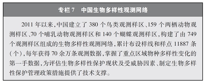 完善監(jiān)測觀測網(wǎng)絡。中國建立起各類生態(tài)系統(tǒng)、物種的監(jiān)測觀測網(wǎng)絡,在生物多樣性理論研究、技術示范與推廣以及物種與生境保護方面發(fā)揮了重要作用,為科研、教育、科普、生產(chǎn)等各領域提供了多樣化的信息服務與決策支持。其中,中國生態(tài)系統(tǒng)研究網(wǎng)絡(CERN)、國家陸地生態(tài)系統(tǒng)定位觀測研究網(wǎng)絡(CTERN)涵蓋所有生態(tài)系統(tǒng)和要素,中國生物多樣性監(jiān)測與研究網(wǎng)絡(Sino BON)覆蓋動物、植物、微生物等多種生物類群,中國生物多樣性觀測網(wǎng)絡(China BON)構(gòu)建了覆蓋全國的指示物種類群觀測樣區(qū)。