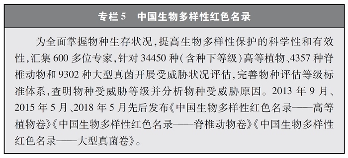 開展全國生物多樣性調(diào)查與評估。大力推進生物多樣性保護重大工程實施,結(jié)合自然資源調(diào)查、生態(tài)系統(tǒng)監(jiān)測評估等工作,不斷完善生物多樣性調(diào)查與評估能力,首次將生物多樣性指標納入生態(tài)質(zhì)量綜合評價指標體系,引導地方加強生態(tài)文明建設與生物多樣性保護。開展自然資源調(diào)查,包括森林、草原、水、濕地、荒漠、海洋等,建立自然資源調(diào)查評價監(jiān)測制度。構(gòu)建了涵蓋2376個縣級行政單元、樣線總長超過3.4萬公里的物種分布數(shù)據(jù)庫,建立物種資源調(diào)查及收集信息平臺,準確反映野生動植物空間分布狀況。完成長江經(jīng)濟帶、京津冀等國家戰(zhàn)略區(qū)域180多個縣級行政區(qū)生物多樣性調(diào)查與評估。組織開展近海漁業(yè)資源調(diào)查,初步掌握近海漁業(yè)資源狀況。陸續(xù)發(fā)布《中國植物紅皮書》《中國瀕危動物紅皮書》《中國物種紅色名錄》《中國生物多樣性紅色名錄》,基本掌握生物多樣性總體情況,為加強生物多樣性保護奠定了科學基礎。