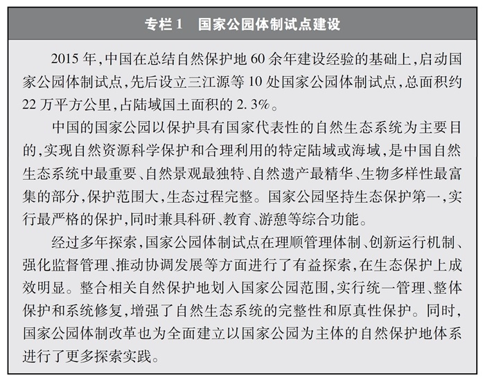 中國不斷推進自然保護地建設,啟動國家公園體制試點,構(gòu)建以國家公園為主體的自然保護地體系,率先在國際上提出和實施生態(tài)保護紅線制度,明確了生物多樣性保護優(yōu)先區(qū)域,保護了重要自然生態(tài)系統(tǒng)和生物資源,在維護重要物種棲息地方面發(fā)揮了積極作用。