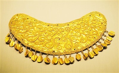 展廳里有不少光彩照人的漢代金飾品,體現了多元文明的融匯。一套出土于鄂爾多斯的金鑲貝玉首飾,由長方形鹿紋金飾牌、方形嵌蚌金串飾、包金玉佩等組成,其中的鹿紋是典型的草原風格紋飾,嵌蚌及其周圍的連珠紋工藝則具有波斯等西方文明的工藝特征。一塊出土于通遼的金飾牌,是薩滿主持祭祀活動時佩戴的飾件,中間雕有一高鼻深目、頭戴尖頂帽的女性,兩側各有一只怪獸,與西伯利亞地區(qū)出土的雙獅守護圣樹金飾牌極為相似。