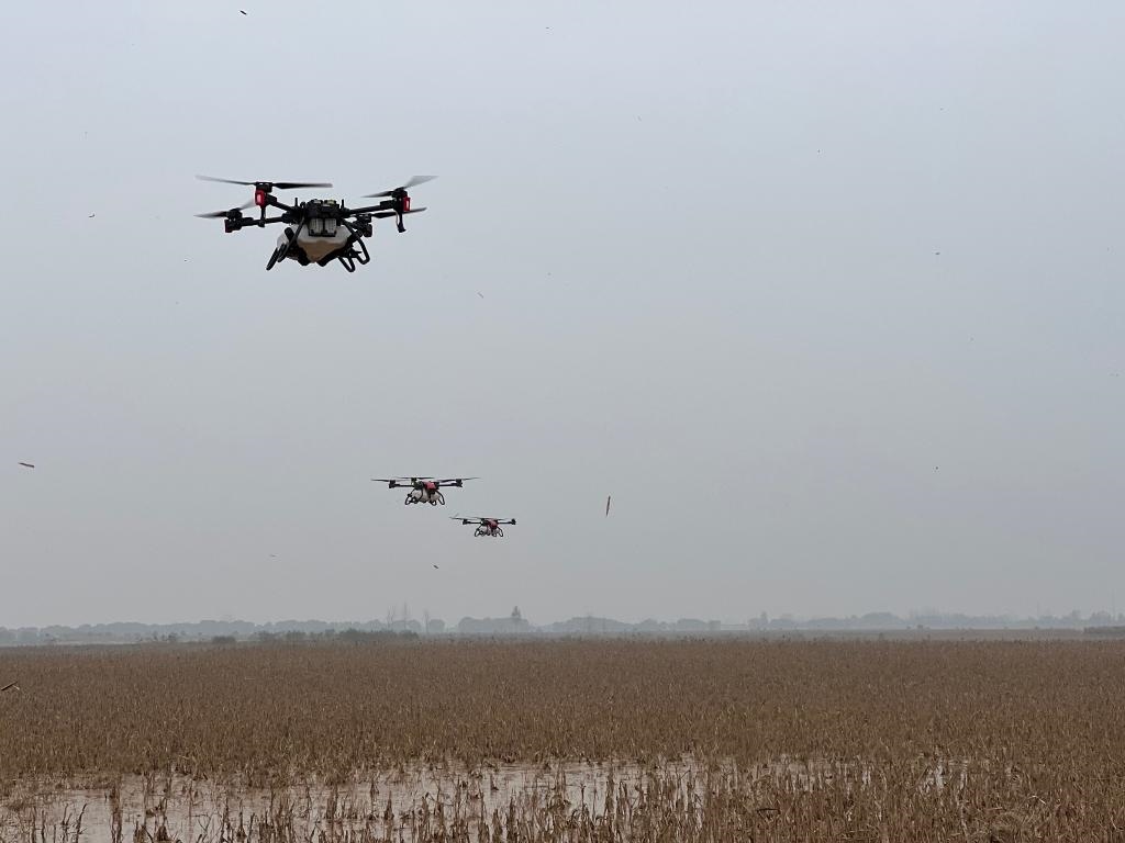 “地不凍,只管種?!笔罘逭f,無人機的快速撒播可以讓種子在土地上凍前及時入土,而且播撒均勻,省時省力,一架無人機一天可以飛播300畝以上,確保小麥及時足額足面積播種。