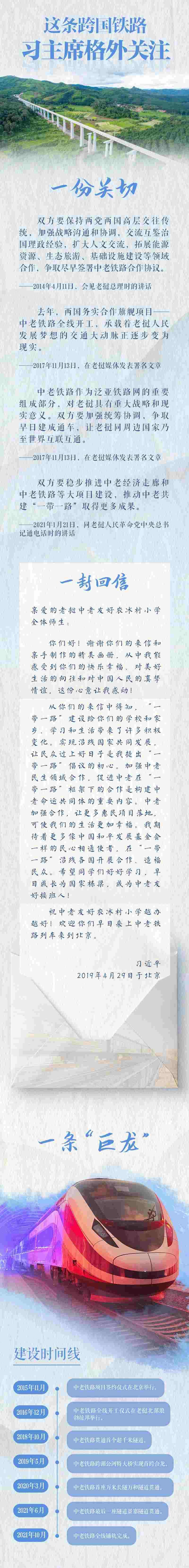 中老鐵路北起中國(guó)昆明,南至老撾萬(wàn)象,全長(zhǎng)1000多公里。這條承載著友誼、科技、綠色、開放的跨國(guó)鐵路,是我國(guó)“一帶一路”倡議與老撾“變陸鎖國(guó)為陸聯(lián)國(guó)”戰(zhàn)略對(duì)接的重要項(xiàng)目,也是“一帶一路”倡議提出以后,首條以中方為主投資建設(shè)、全線采用中國(guó)技術(shù)標(biāo)準(zhǔn)、使用中國(guó)設(shè)備并與中國(guó)鐵路網(wǎng)直接聯(lián)通的跨國(guó)鐵路。對(duì)于這條鐵路,習(xí)近平主席一直格外關(guān)注。他與老撾高層多次就中老鐵路建設(shè)進(jìn)行深入溝通,并給老撾萬(wàn)象中老友好農(nóng)冰村小學(xué)師生回信,歡迎他們?cè)缛粘松现欣翔F路列車來(lái)到北京。