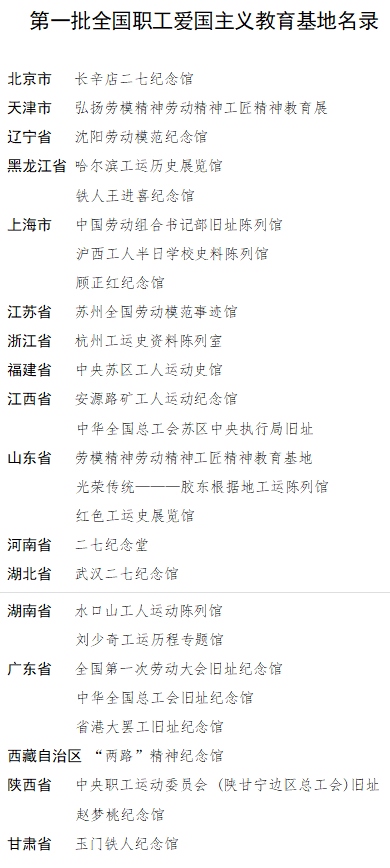 第一批全國職工愛國主義教育基地包括北京市長辛店二七紀念館、黑龍江省鐵人王進喜紀念館、上海市中國勞動組合書記部舊址陳列館、廣東省全國第一次勞動大會舊址紀念館、陜西省中央職工運動委員會(陜甘寧邊區(qū)總工會)舊址等27家單位。旨在進一步加強紅色工運資源的保護挖掘和宣傳利用,引領(lǐng)各級工會努力把紅色工運資源建設(shè)成為開展黨史學習教育的重要陣地,打造成愛國主義教育、革命傳統(tǒng)教育、加強職工思想政治引領(lǐng)的生動課堂,團結(jié)引導(dǎo)廣大職工群眾更好傳承紅色基因、賡續(xù)紅色血脈、汲取奮進力量。第一批全國職工愛國主義教育基地在中國工運史上影響重大,代表性強、知名度高,現(xiàn)有的設(shè)施建設(shè)和保護利用較好,符合時代要求,具有較強的示范引領(lǐng)作用。