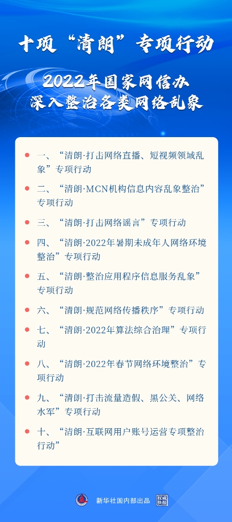 新華社北京3月17日電(記者王思北)記者17日從國(guó)新辦舉行的新聞發(fā)布會(huì)獲悉,2022年“清朗”系列專(zhuān)項(xiàng)行動(dòng)將重點(diǎn)開(kāi)展打擊網(wǎng)絡(luò)謠言,打擊網(wǎng)絡(luò)直播、短視頻領(lǐng)域亂象,算法綜合治理,暑期未成年人網(wǎng)絡(luò)環(huán)境整治等十方面任務(wù)?! ?/p>
