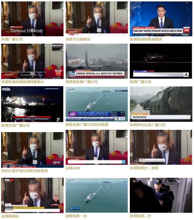總臺(tái)亞非中心制作的外交部、全國(guó)人大常委會(huì)、中共中央臺(tái)灣工作辦公室、全國(guó)政協(xié)外事委員會(huì)、國(guó)防部、東部戰(zhàn)區(qū)、王毅國(guó)務(wù)委員兼外長(zhǎng)發(fā)表的相關(guān)聲明和談話得到了日本、韓國(guó)、印度、土耳其、印尼、伊朗等對(duì)象國(guó)250多家主流媒體轉(zhuǎn)載近5000篇次。