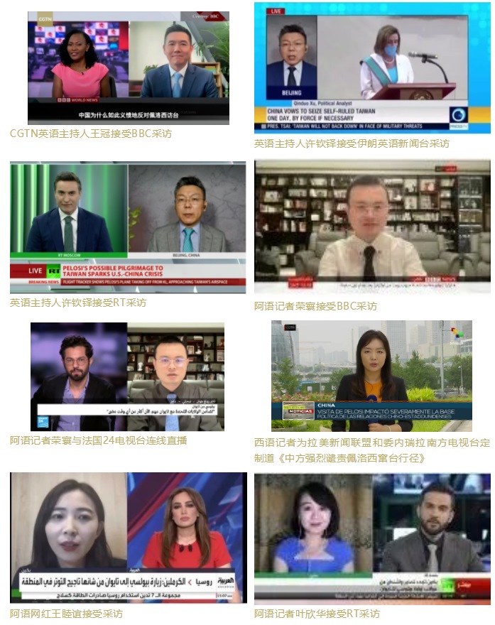 CGTN英、西、法、阿、俄等多語(yǔ)種主播、評(píng)論員和網(wǎng)紅積極在多家外媒發(fā)聲,接受了包括英國(guó)廣播公司(BBC)、今日俄羅斯(RT)、伊朗英語(yǔ)新聞臺(tái)(Press TV)、拉美新聞聯(lián)盟、貝寧E-TELE電視臺(tái)、法國(guó)24電視臺(tái)、沙特阿拉比亞電視臺(tái)以及以色列i24news電視臺(tái)等多家國(guó)際媒體的采訪連線,主動(dòng)闡釋中方立場(chǎng),分析佩洛西這一挑釁行徑背后的虛偽動(dòng)因,揭批美國(guó)在臺(tái)灣問(wèn)題上“說(shuō)一套做一套”、侵犯中國(guó)的主權(quán)和領(lǐng)土完整的行為。