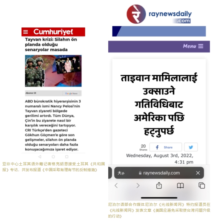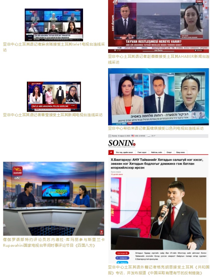 亞非中心土耳其、希伯來(lái)語(yǔ)、豪薩語(yǔ)、尼泊爾語(yǔ)、蒙古語(yǔ)等多語(yǔ)種主播、評(píng)論員和網(wǎng)紅積極在多家外媒發(fā)聲,接受了包括以色列電視臺(tái)、土耳其AHABER新聞臺(tái)、土耳其TGRT電視臺(tái)、土耳其新聞電視臺(tái)等多家國(guó)際媒體的采訪連線,同時(shí)多名外籍記者、海外特約評(píng)論員在尼日利亞《領(lǐng)導(dǎo)者報(bào)》網(wǎng)站、尼泊爾《光線新聞網(wǎng)》、肯尼亞《人民報(bào)》、蒙古國(guó)媒體SONIN.MN等對(duì)象國(guó)主流媒體發(fā)表評(píng)論及署名文章,對(duì)外闡釋中方立場(chǎng)和反制措施的合理性、正當(dāng)性,介紹臺(tái)灣問(wèn)題歷史經(jīng)緯,揭批美國(guó)在臺(tái)灣問(wèn)題上的背信棄義。