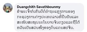 老撾黨中央機(jī)關(guān)報(bào)前總編輯、社長(zhǎng)端吉·薩瓦本彌(Duangchith Savathbounmy)留言:“認(rèn)同我的祖國(guó)對(duì)臺(tái)灣問(wèn)題的表態(tài),支持一個(gè)中國(guó)原則,臺(tái)灣是中國(guó)不可分割的一部分?!?/p>
