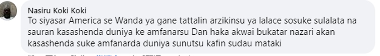 尼日利亞網(wǎng)友納斯魯(Nasiru Koki Koki)留言:“正是美國(guó)自身經(jīng)濟(jì)的衰退,使得它如此迫切地想要阻止其他國(guó)家的經(jīng)濟(jì)發(fā)展,面對(duì)美國(guó)的挑釁,中國(guó)應(yīng)采取審慎的態(tài)度?!?/p>
