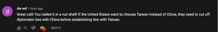 網(wǎng)友dw wd:“精彩的一期視頻!你簡(jiǎn)潔而清晰地呈現(xiàn)了內(nèi)容,如果美國(guó)真的想選擇與臺(tái)灣建立所謂的‘外交關(guān)系’,他們首先需要與中國(guó)斷交。”