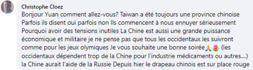 法語(yǔ)網(wǎng)友克羅茲:“臺(tái)灣始終是中國(guó)的一個(gè)省,美國(guó)人一會(huì)兒承認(rèn)一會(huì)兒又不承認(rèn),現(xiàn)在他們又開(kāi)始搗亂。為什么要制造這種毫無(wú)意義的緊張氣氛呢?中國(guó)是一個(gè)經(jīng)濟(jì)和軍事大國(guó),我不認(rèn)為西方會(huì)跟著美國(guó)走,就像之前的奧運(yùn)會(huì)一樣,西方國(guó)家太依賴于中國(guó)工業(yè)了。俄羅斯應(yīng)該是支持中國(guó)的吧,昨天紅場(chǎng)上方都飄著中國(guó)國(guó)旗?!?/p>